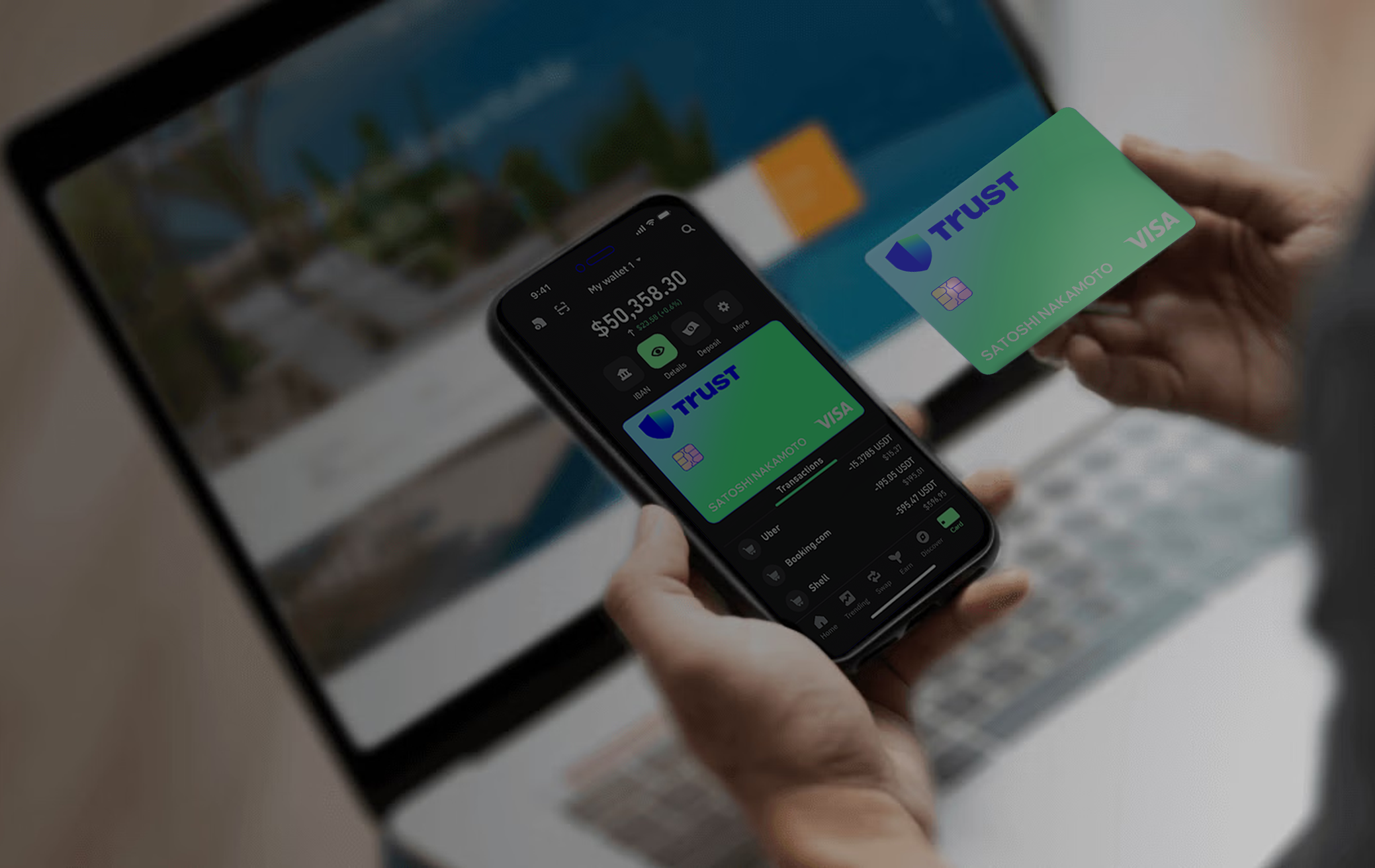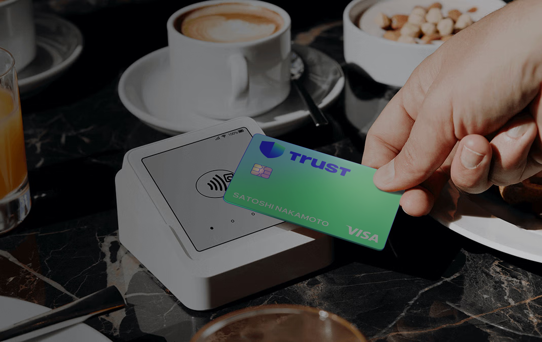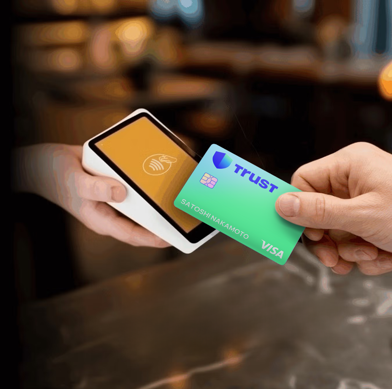 Оформи в один клик внутри кошелька Trust Wallet. Не требует прохождения KYC верификаций, высокие лимиты, поддержка Apple Pay и Google Pay, конвертация платежей прямо с баланса.